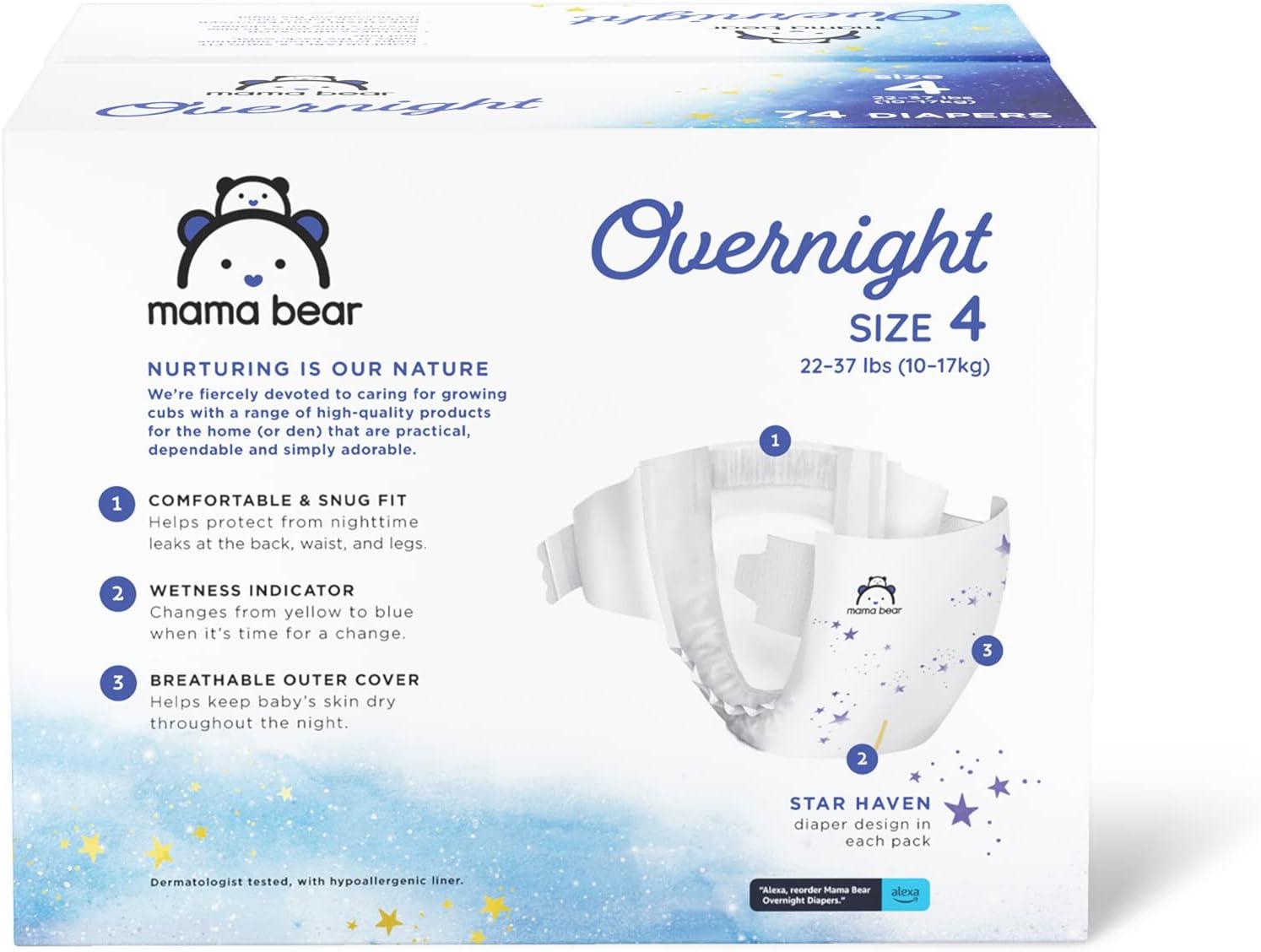 Amazon Brand - Mama Bear Disposable Overnight Baby Diapers, Hypoallergenic, Night Time Protection, Size 4 (74 Count), White(Size 4 (74 Count))