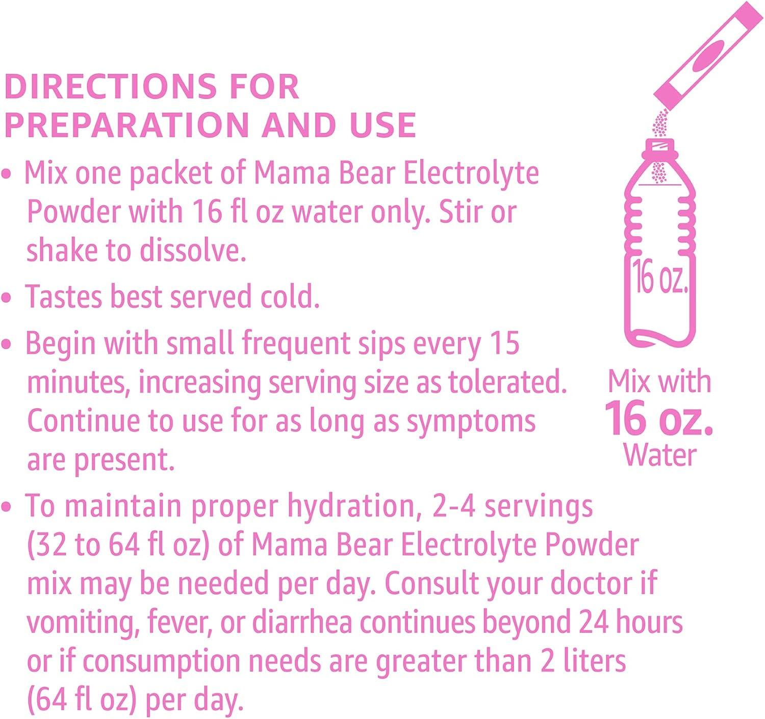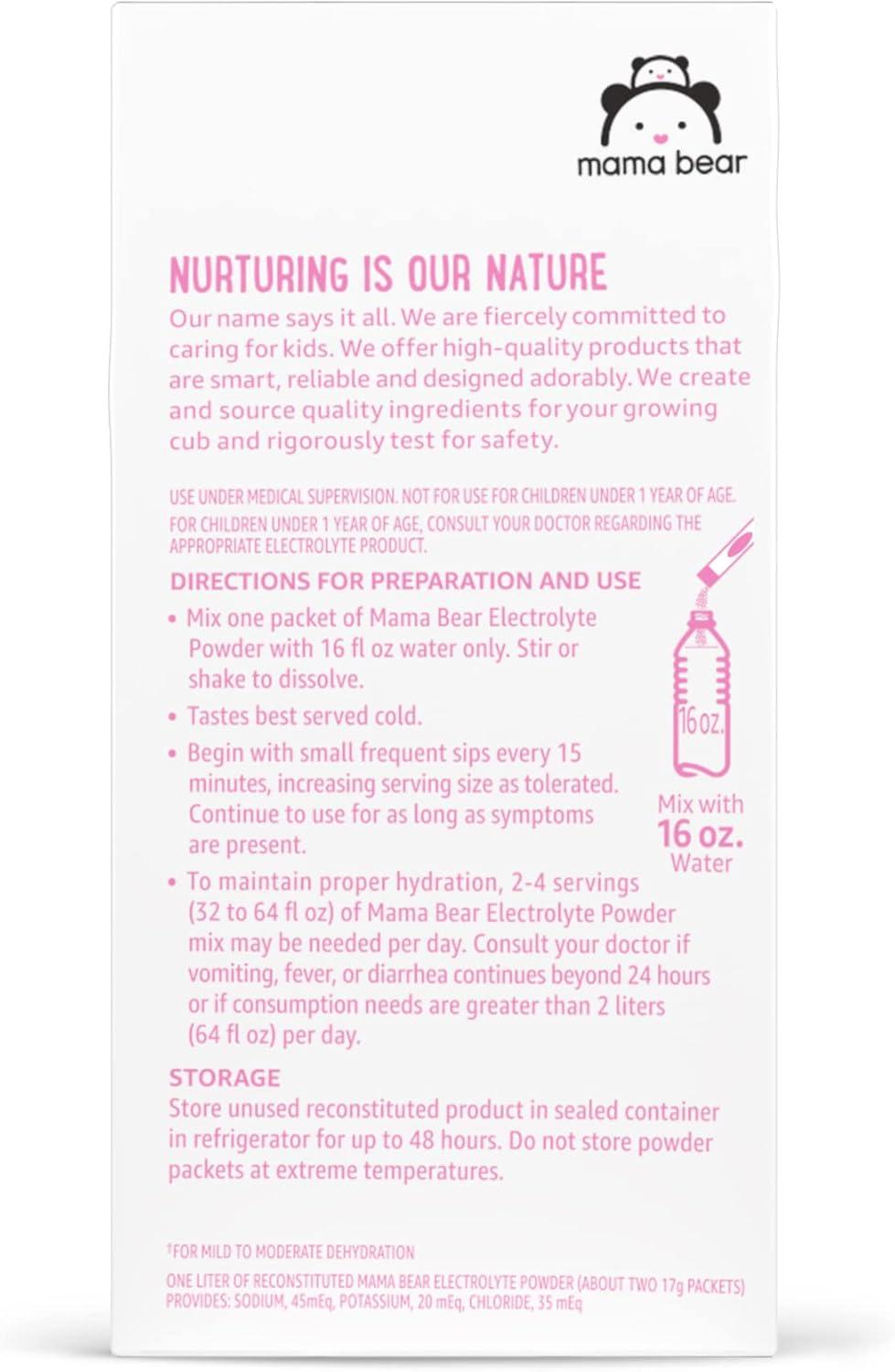 If you like Pedialyte, we invite you to try Mama Bear Electrolyte Powder Packets. Help your little one rehydrate quickly with Mama Bear Electrolyte Powder Packets in tasty strawberry lemonade flavor. These electrolyte replacement drink packets provide medical grade hydration. The balance of sugar and electrolytes is recommended by the American Academy of Pediatrics; Kleinman RE, 2019. For mild to moderate dehydration. Each serving contains more electrolyte sodium compared to the leading sports drinks, soda, 100 percent apple juice and water. Recommended by pediatricians and pharmacists. For children and adults. Quickly replenishes fluids and electrolytes to help prevent dehydration due to vomiting and diarrhea, intense exercise, heat exhaustion and travel. Electrolyte powder drink mix packets are convenient to carry and easy to bring along wherever life takes you. Simply mix and dissolve powder into water for fast, effective rehydration. This product is not manufactured or distributed by the owner of the registered trademark Pedialyte.