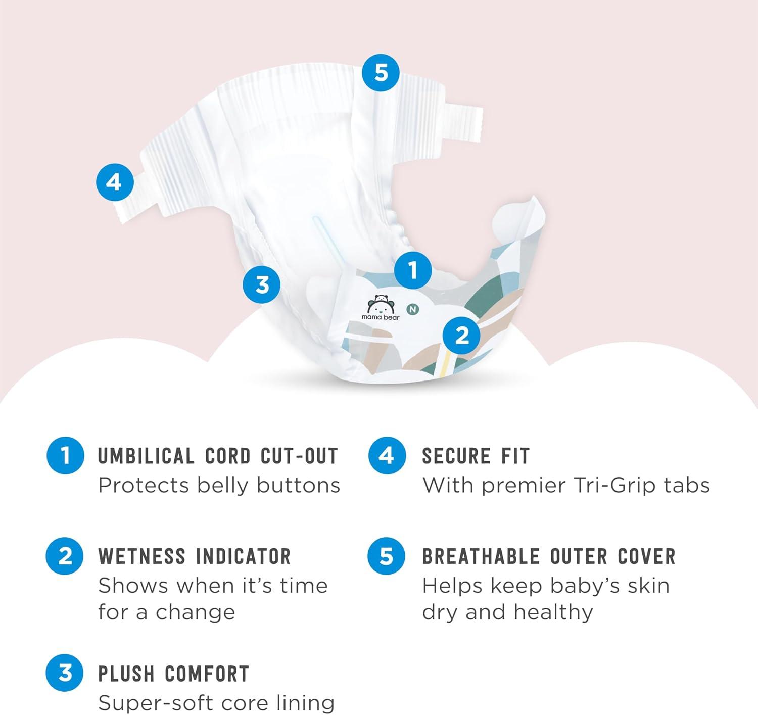 Stretch fasteners and elastic waistband with premier Tri-Grip tabs for a secure hold around your baby; Umbilical cord cutout to protect baby's belly button; Each pack contains two diaper designs, White and Cloud Dreams