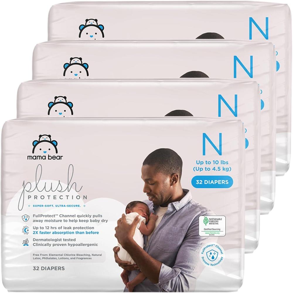 Amazon Brand – Mama Bear Plush Protection Diapers – Size Newborn, One Month Supply, Hypoallergenic Premium Disposable Baby Diapers, 128 Count (Pack of 4), White and Cloud Dreams(Newborn (128 Count))