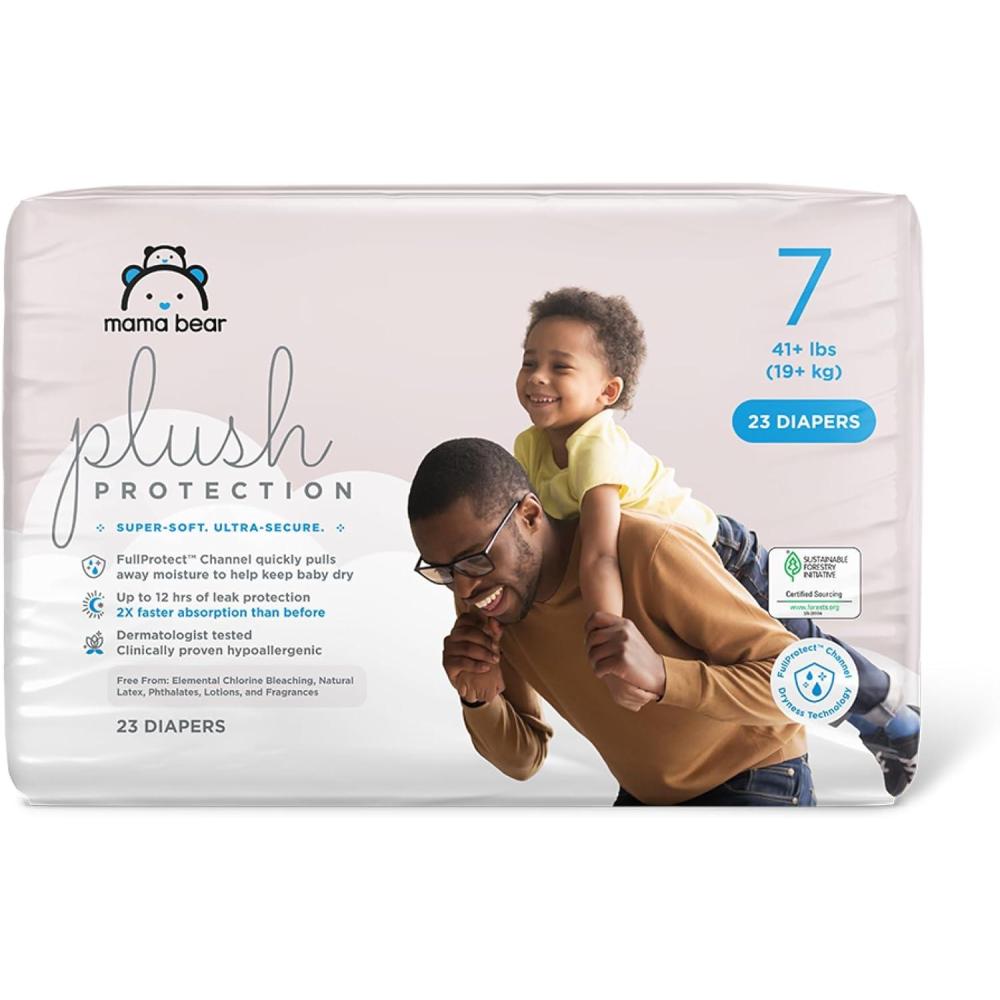 Amazon Brand – Mama Bear Plush Protection Diapers – Size Newborn, One Month Supply, Hypoallergenic Premium Disposable Baby Diapers, 128 Count (Pack of 4), White and Cloud Dreams(Size 7 (23 Count))
