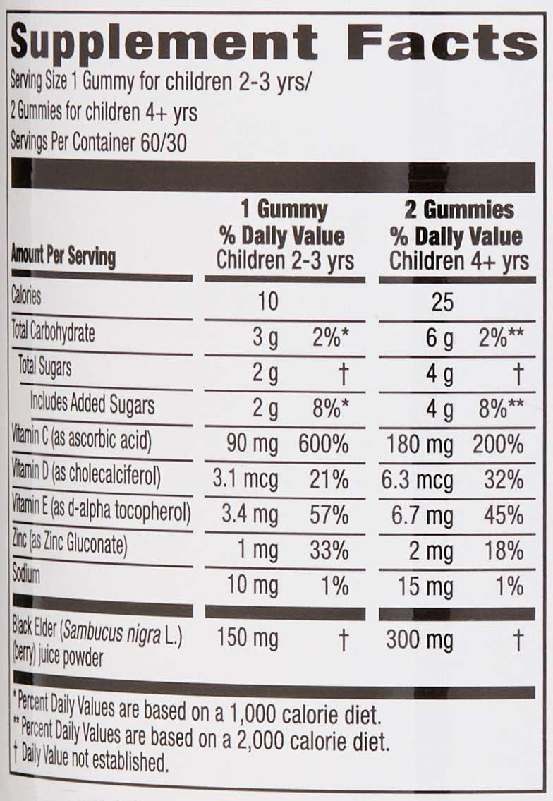 Contains 300mg Black Elder juice powder per serving (2 gummies) as well as Vitamins A, C, D, E and Zinc